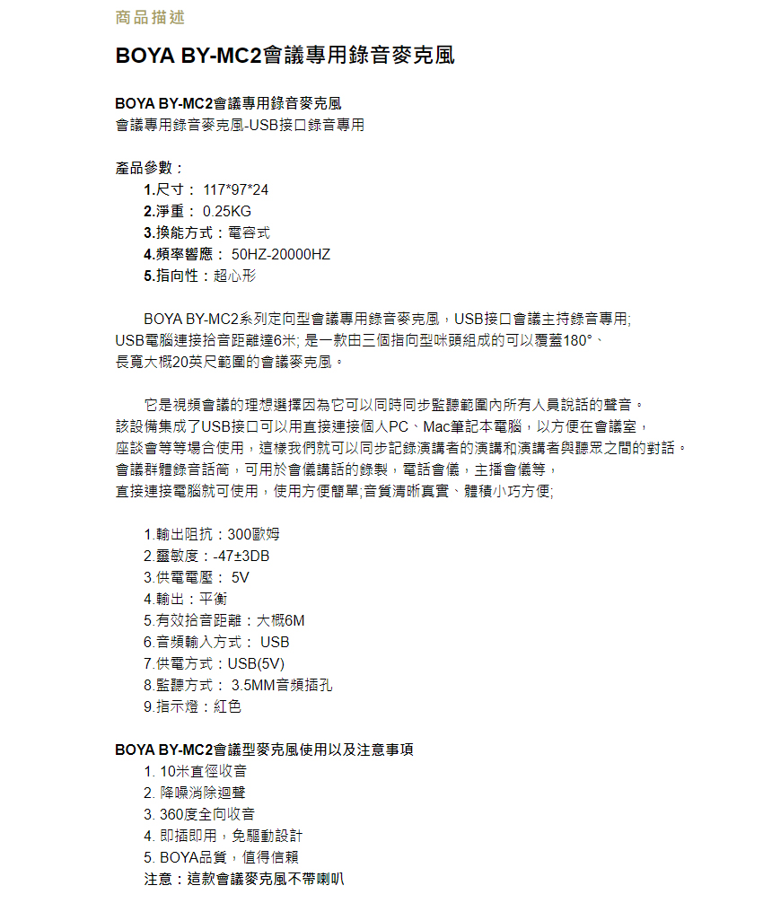BOYA 博雅 BY-MC2會議專用錄音麥克風 立福公司貨