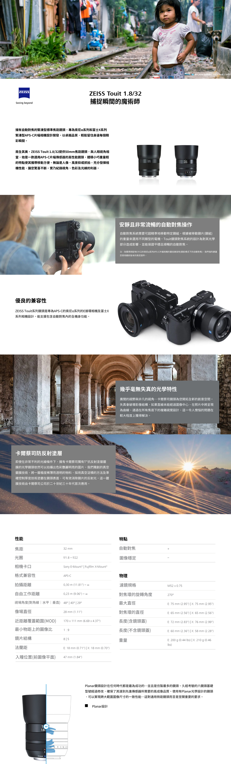 Zeiss 蔡司 Touit 32mm F1.8 Sony APS-C E接環專用鏡頭 正成公司貨