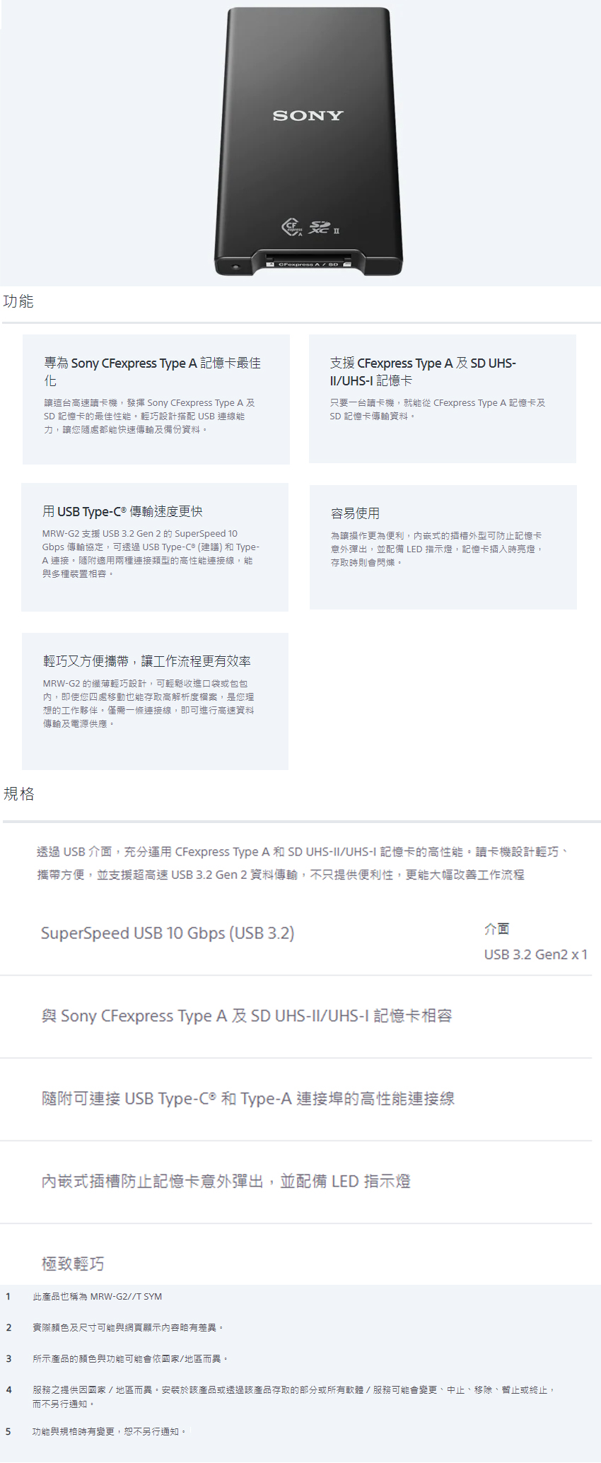 SONY MRW-G2 CFexpress Type A / SD 記憶卡讀卡機 索尼公司貨