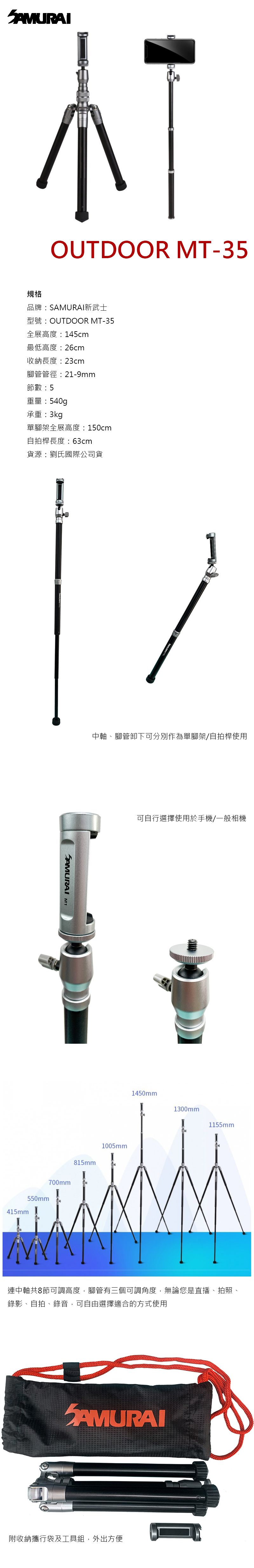Samurai 新武士 OUTDOOR MT-35 反摺式摺疊旅行用三腳架 輕量化設計 適用於智慧型手機及相機