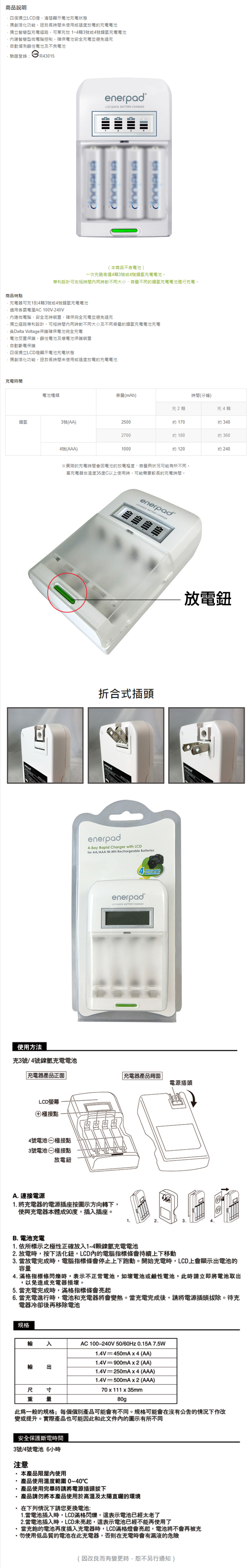 enerpad TG2800 鎳氫電池充電器 3號4號電池通用 電量顯示 安全充電 檢驗合格